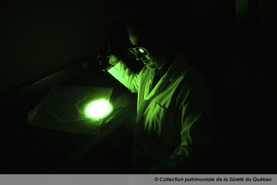 Il observe une pièce à conviction (sac de plastique) à l’aide d’un laser émettant une longueur d'onde de 532 nanomètres. La pièce à conviction a été préalablement traitée aux vapeurs de cyanoacrylate et colorée à la Rhodamine 6G.