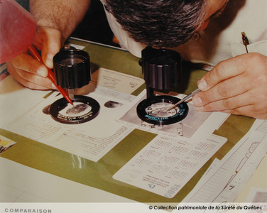 Spécialiste en empreintes digitales du Service de l'identité judiciaire, en 1989. Il effectue une comparaison d’empreintes digitales.