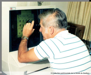Entre 1971 et 1987Laval Perron, spécialiste en empreintes digitales au Service de l'identité judiciaire, entre 1971 et 1987. Il effectue l’expertise d’une empreinte digitale à l’aide du système mécanisé Miracode au Grand quartier général de la Sûreté du Québec, à Montréal.