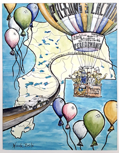 Sur cette œuvre, le territoire du district et la route le sillonnant évoquent l’immensité de la région à desservir. Cette particularité locale requiert vigilance, passion, intégrité, courage et performance au travail. La montgolfière survolant le district symbolise la bienveillante surveillance des activités du territoire par la Sûreté du Québec offrant ainsi un sentiment de sécurité à la population desservie. La présence des employés de l’organisation dans la nacelle de la montgolfière met en lumière leur promptitude à intervenir.