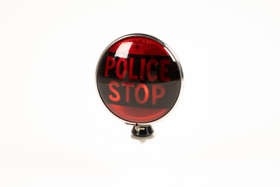 Entre 1963 et 1970Phare d’intervention « Police Stop » fabriqué par Dominium Auto. Ce phare est installé à l’avant de la voiture de patrouille, côté passager, et il est allumé par le patrouilleur pour signaler à un conducteur fautif qu’il doit s’immobiliser en bordure de la route.
