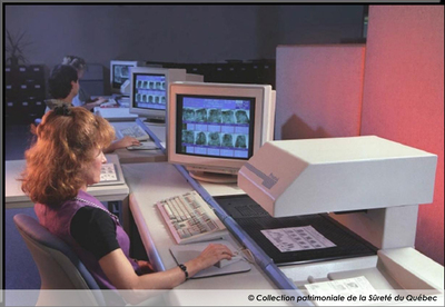1992Spécialistes en empreintes digitales du Service de l'identité judiciaire, en 1992. Elles utilisent le nouveau système automatisé d'identification dactyloscopique (SAID) Orion de Printrak, au Grand quartier général de la Sûreté du Québec, à Montréal.