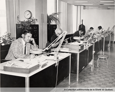 Vers 1980Employés de la section des empreintes digitales, une unité spécialisée du Service de l’identité judiciaire, au Grand Quartier général de la Sûreté du Québec à Montréal, vers 1980.
