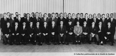 Assermentation du 5e contingent de la Sûreté provinciale à l’École de police du Québec, le 7 décembre 1961. Ce contingent est le dernier à avoir suivi sa formation à la Palestre nationale de Montréal avant l’ouverture des nouveaux locaux de l’École de police du Québec située sur la rue Poupart à Montréal.