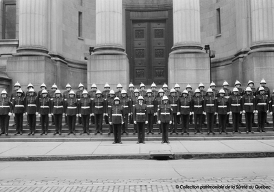 Groupe de gendarmes de la Sûreté provinciale en tenue d’apparat devant le palais de justice de Montréal, en mars 1941.