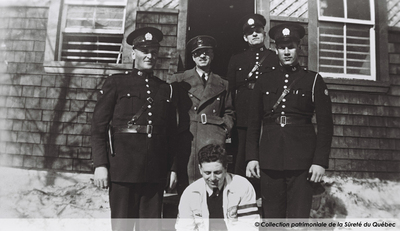 Deux gendarmes du District de Québec et deux policiers de la Police de la route lors de la grève de l'amiante, à Asbestos, en mai 1949. À cette époque, la Police de la route était sous l'autorité de la Sûreté provinciale.